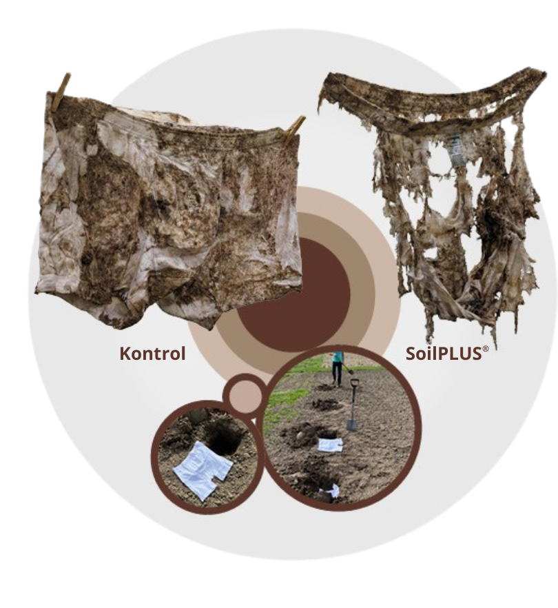Kontrol çiftinin (solda) ayrışma süreci yalnızca minimal bir aktivite göstermektedir. SoilPLUS® ile işlem görmüş topraklı çift (sağda) ise topraktaki artan bakteri aktivitesi nedeniyle neredeyse tanınmaz haldedir.
