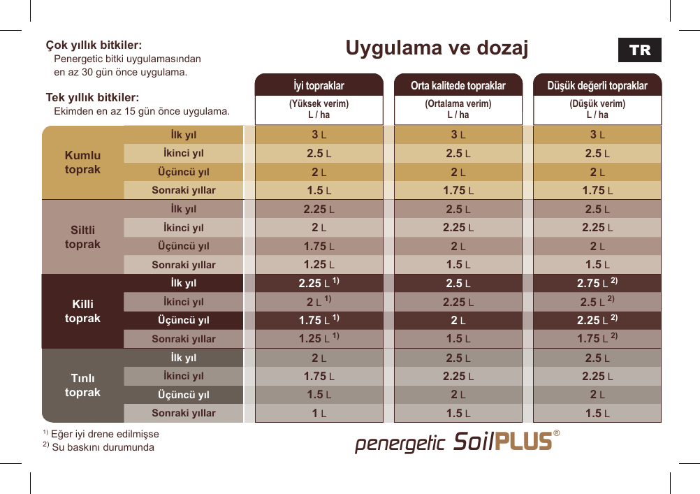 Önerilen dozaj, toprağın bireysel koşullarına göre ayarlanmalıdır: SoilPLUS®, toprağa uygulanabilen bir üründür (katı veya sıvı). Tek başına veya gübre, herbisit, biyolojik ürünler gibi diğer ürünlerle karıştırılarak kullanılabilir.